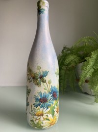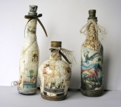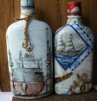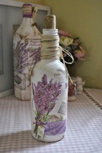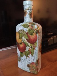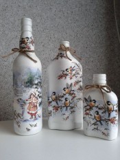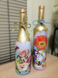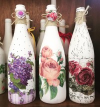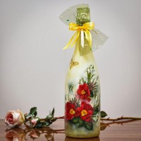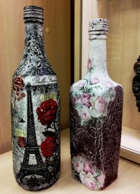 Любителей рукоделия интересует, что нужно для нанесения рисунка на бутылку в техникедекупаж. Для качественной работы понадобится специальный клей, который можно купить в специализированных магазинах. Из готовых составов хорошо подойдут следующие: Decola, La Doratura и Mod Podge PLAID. При желании, можно приготовить клеящий состав самостоятельно, используя 1 часть желатина на 2 части воды или разбавленный водой клей ПВА в соотношении 1:1. Потребуются также кисти, в том числе веерная, а также валик для разглаживания рисунка. Вместо вырезания ножницами, для гнутой поверхности лучше выделить рисунок из салфетки путем обрывания краев. Наложив фрагмент узора на подготовленную поверхность, надо разгладить его кисточкой и начать нанесение клея с середины рисунка. Можно использовать метод файла, намазав предварительно участок поверхности бутылки клеевым составом. Завершить работу надо лаковым покрытием, после полного высыхания клея.