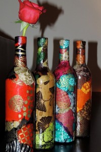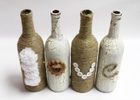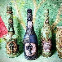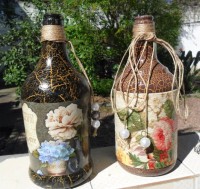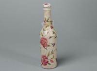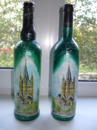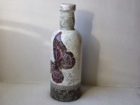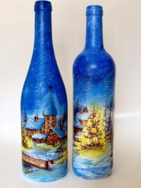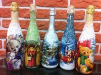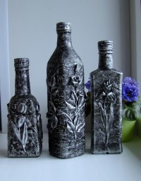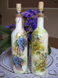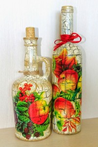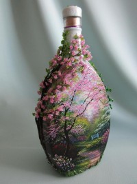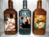 Часто в оформлении бутылок с напитками, для различных торжеств и праздничных застолий, требуется сделать объемные композиции. Наросты выполняют с помощью полимерной глины или обычной шпатлевкой, заправленной в пустой пластиковый тюбик из-под клея. Для большей степени адгезии между глиной и стеклом можно использовать декупажный клей, который называется «Секунда». После высыхания наростов, их необходимо зашкурить и нанести рисунок, вырезанный из салфетки, докрашивая нужные участки акриловыми красками. Интересные идеи для декора бутылок или ваз из стекла смотрите ниже на фото: