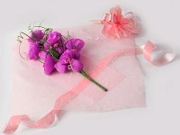 С помощью тейп-ленты крепим поочерёдно 7 конфет к шампурчикам для барбекю. Добавляем зелень. Декорируем сеткой. Украшаем красивым бантом.