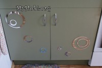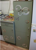 Для декора фасадов я выбрала зеркальные наклейки-кольца (заказали в Китае). И после декорирования получилась вот такая новенькая кухня.