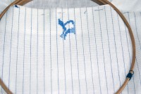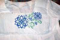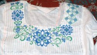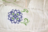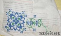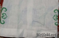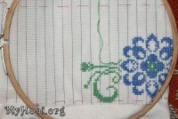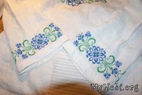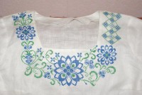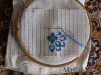 Нитки использую: голубые - Ариадна (матовые) и зеленые Белка (блестящие). Обе ниточки испробованы в боевых условиях - не линяют, не мохрятся. Немного перетираются о канву, она очень сильно прокрахмалена. Но шьется очень легко, я прям не ожидала - столько у меня эта сорочка лежала в ожидании...)))