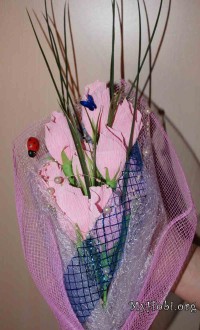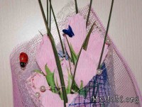 Использовала розовую и зеленую гофрированную бумагу, белую органзу и сеточки двух цветов для оформления - белую и розовую, а также синие ленты и веточки, и первый раз использовала нитку бусин. Ну и конечно бабочка и божья коровка присутствуют в обязательном порядке - куда ж без них