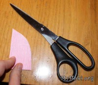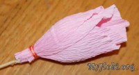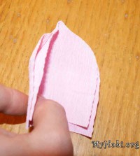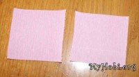 Из розовой гофрированой бумаги вырезала 2 одинаковых квадрата , срезала угол, а придала форму лепестка