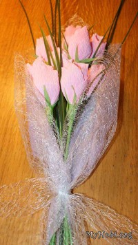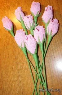 Потом из зеленой гофрированой бумаги вырезала прямоугольник, срезала зубчиками чтоб получились листики, и с помощью пистолета закрепила их у основания бутона. Потом сформировала стебель и получились вот такие розочки.